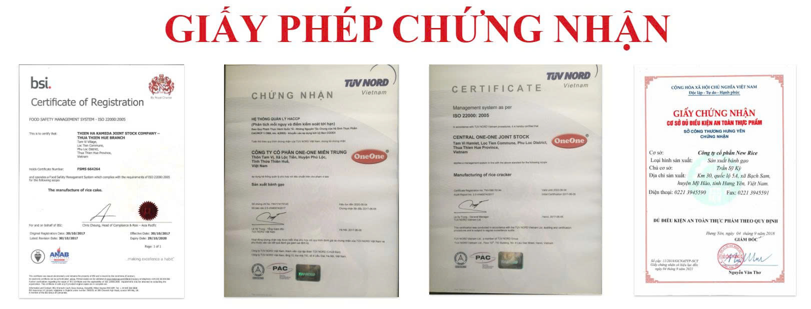 One One cam kết đặt sức khỏe và an toàn của người tiêu dùng lên hàng đầu. Sản phẩm của chúng tôi được sản xuất theo tiêu chuẩn quốc tế, đạt chứng nhận ISO 22000:2005 về vệ sinh an toàn thực phẩm do BSI cấp và tuân thủ hệ thống quản lý HACCP – Phân tích mối nguy và điểm kiểm soát tới hạn. One One liên tục được chứng nhận là Hàng Việt Nam Chất Lượng Cao từ 2010 đến nay. Đây là minh chứng cho quy trình kiểm soát nghiêm ngặt, đảm bảo chất lượng và sự an tâm trong từng sản phẩm bánh gạo.