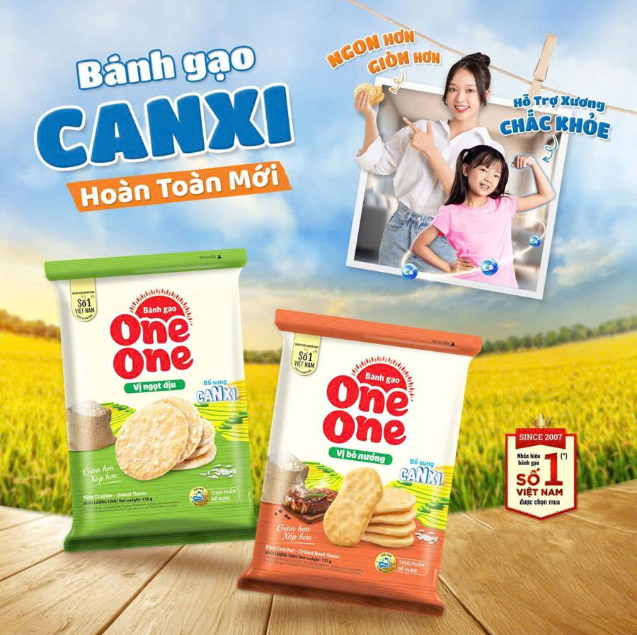 • Đậm đà vị bò nướng – Tăng cường Canxi mỗi ngày!: Phiên bản mới của Bánh Gạo One One vị Bò Nướng giòn ngon đậm đà bổ sung Canxi hỗ trợ xương chắc khỏe, kết hợp bao bì sinh động hấp dẫn – vừa ngon miệng, vừa tốt cho sức khỏe, càng ăn càng cuốn.