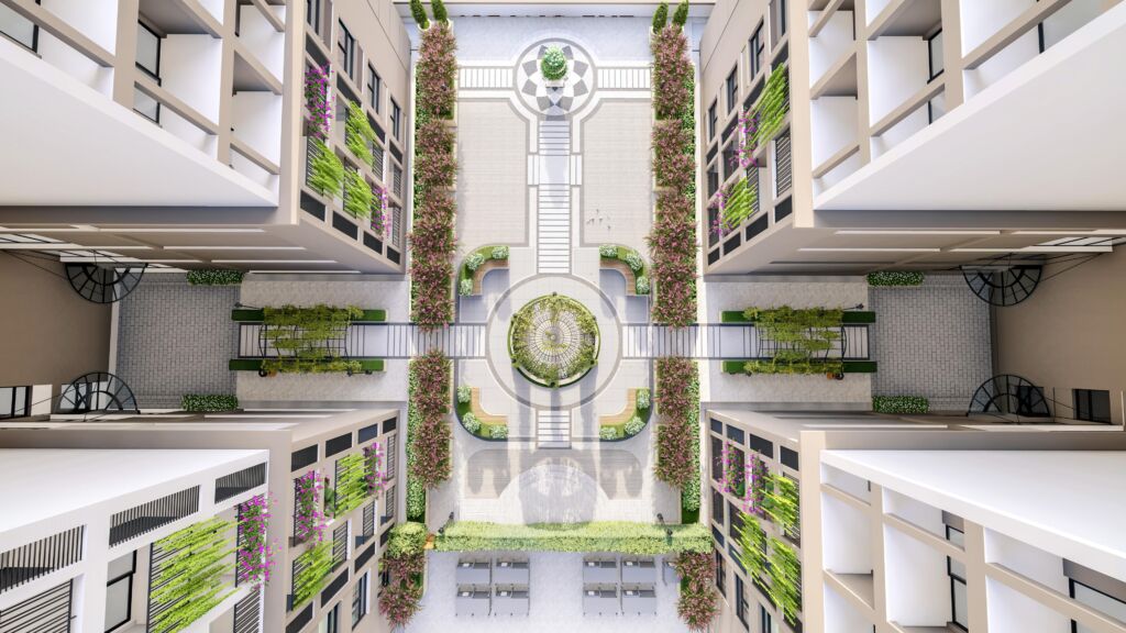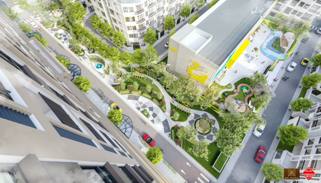 Không gian xanh: Giữa các tòa nhà được bố trí công viên cây xanh, đường dạo bộ, mang lại không khí trong lành.