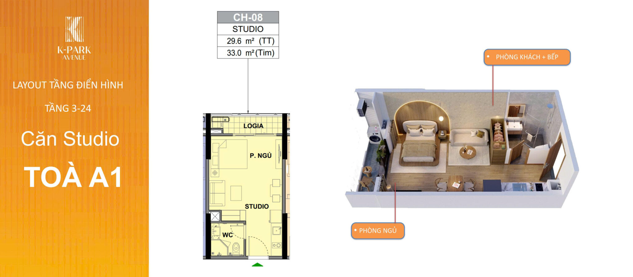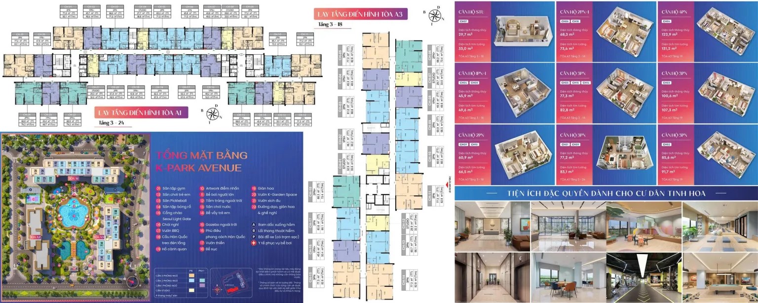 Phân khu K-Park Avenue: 3 tòa căn hộ cao 20 tầng(A2,A3) và 25 tầng(A1); 2 tầng hầm; 1 tầng thương mại với 1227 căn hộ.