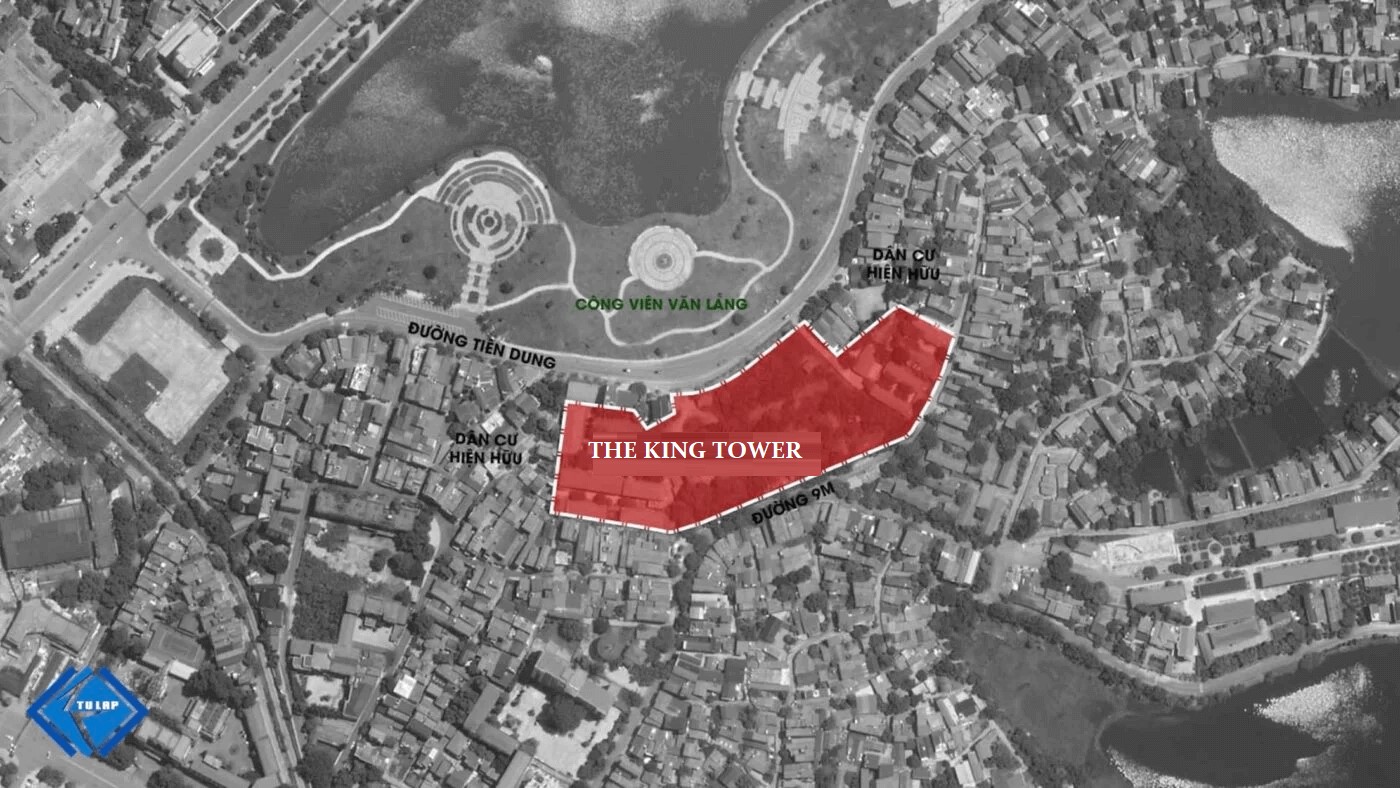 Dự án The King Tower tọa lạc tại đường Tiên Dung, phường Tiên Cát, thành phố Việt Trì, tỉnh Phú Thọ. Dự án hướng trực diện ra công viên hồ điều hòa Văn Lang tuyệt đẹp, sát bên “lá phổi xanh” của thành phố, tổ hợp quy mô trực tiếp thụ hưởng một khuôn viên thiên nhiên mát lành “độc nhất vô nhị”. Chung cư The King Tower sở hữu thế đất cao tựa sơn – hướng thủy, có mặt trước hướng nhìn ra hồ điều hòa Công viên Văn Lang rộng 116,2 ha và mặt sau “thế tựa núi” Ninh Nghĩa.