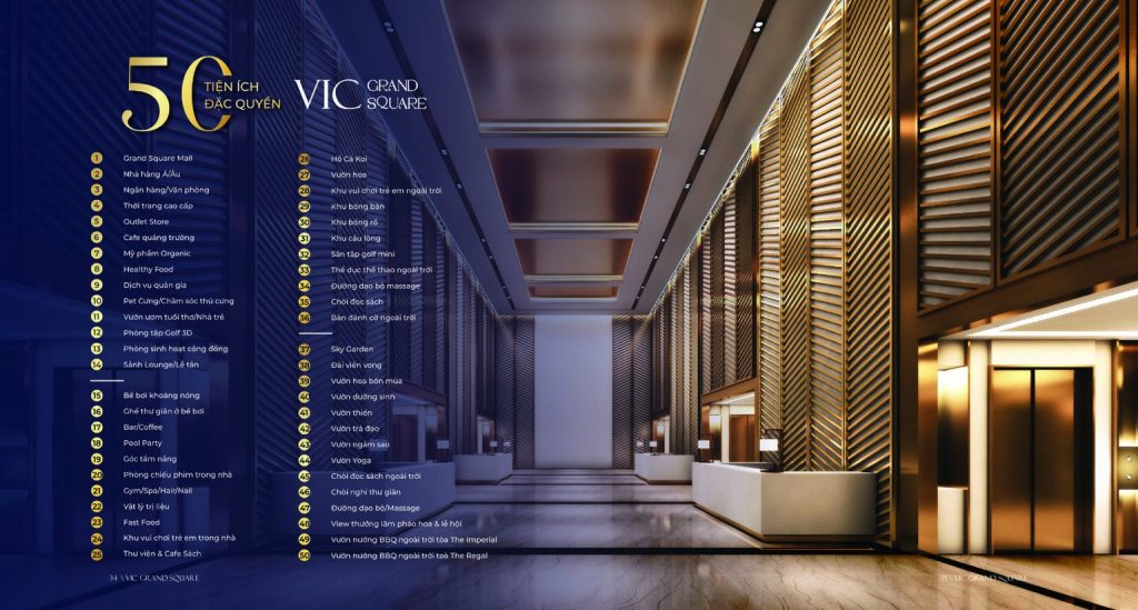 Không những mang tới khách hàng những căn hộ được thiết kế hiện đại, sang trọng. Tại dự án Vic Grand Square còn hội tụ đầy đủ những tiện ích đẳng cấp vượt trội hiện đại, đẳng cấp và trọn vẹn cho cuộc sống an cư lâu dài.