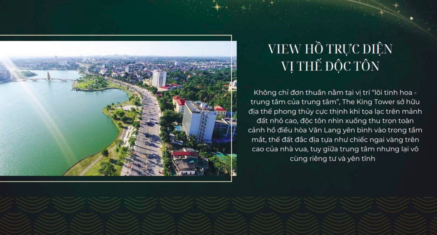 King Tower Việt Trì toạ lạc tại trung tâm Hồ Công Viên Văn Lang đường Tiên Dung Viên ngọc – Vịnh cạn giữa lòng thành phố Việt Trì. Hội tụ Tiêu Chí “”ALL IN ONE”” đầu tiên tại Phú Thọ, dự án đang “trải thảm” chào đón những nhà đầu tư nhạy bén với thiết kế xây dựng theo phong cách Châu Âu chuẩn quốc tế 5 Sao sẽ khiến cho cảm giác như lúc nào cũng đang ở khu nghỉ dưỡng.