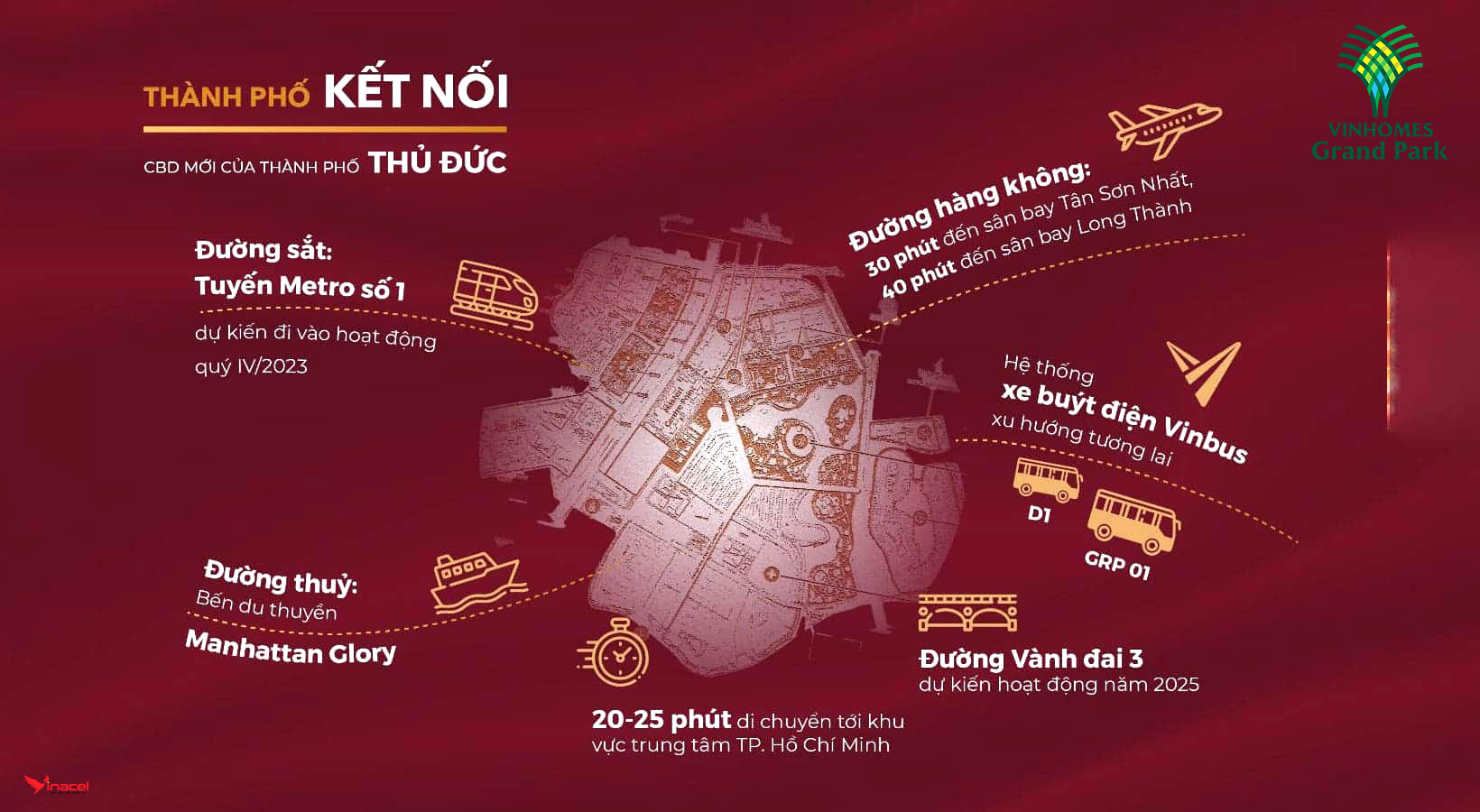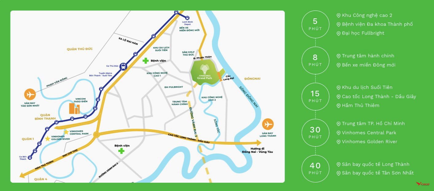 Hiện tại từ Vinhomes Grand Park, cư dân có thể di chuyển nhanh chóng đến các trung tâm hành chính, thương mại và vui chơi lớn trong thành phố như: