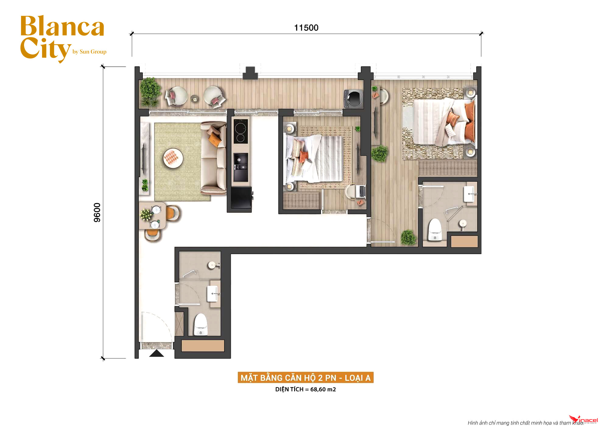 • 2 phòng ngủ (2PN): từ 68 – 70 m², phù hợp gia đình nhỏ.