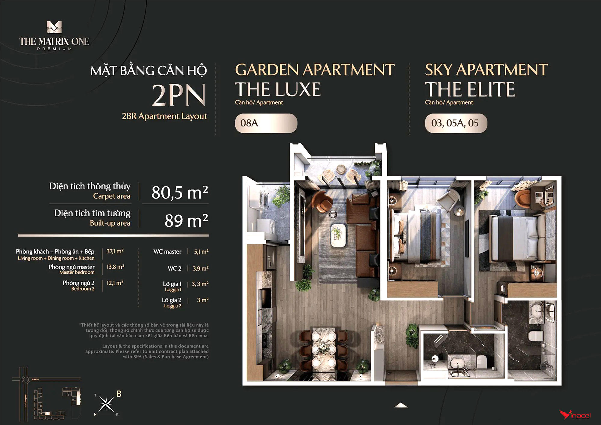 • Căn 2 phòng ngủ, 2 vệ sinh: Diện tích 81m2, 86m2, 87m2.
