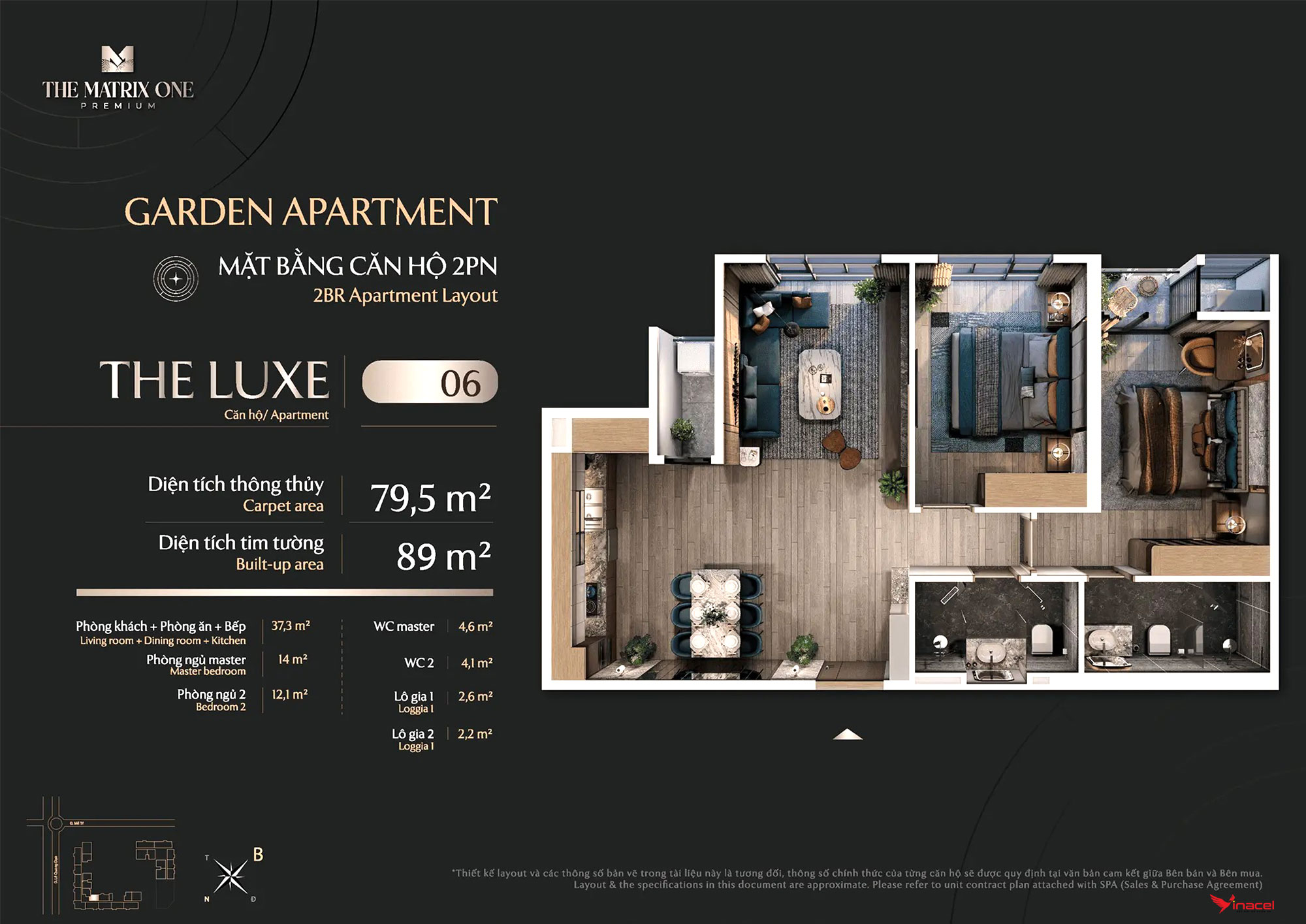 • Căn 1 phòng ngủ, 1 vệ sinh: Diện tích 37.4m2.