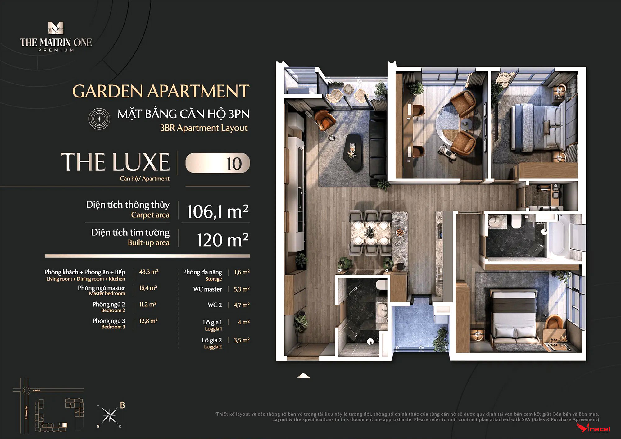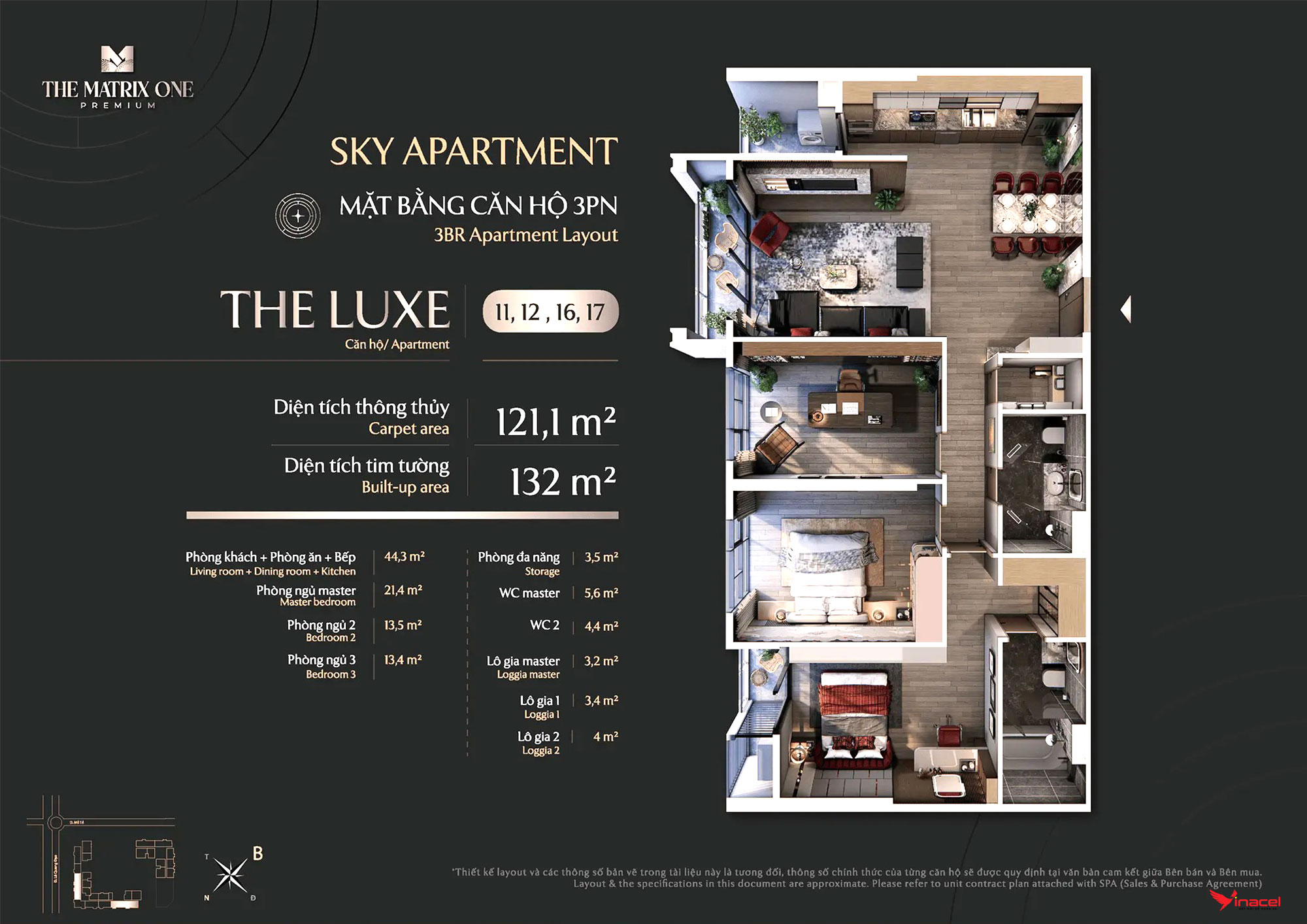 • Căn 3 phòng ngủ, 2 vệ sinh: Diện tích 115m2, 110m2, 122m2.
