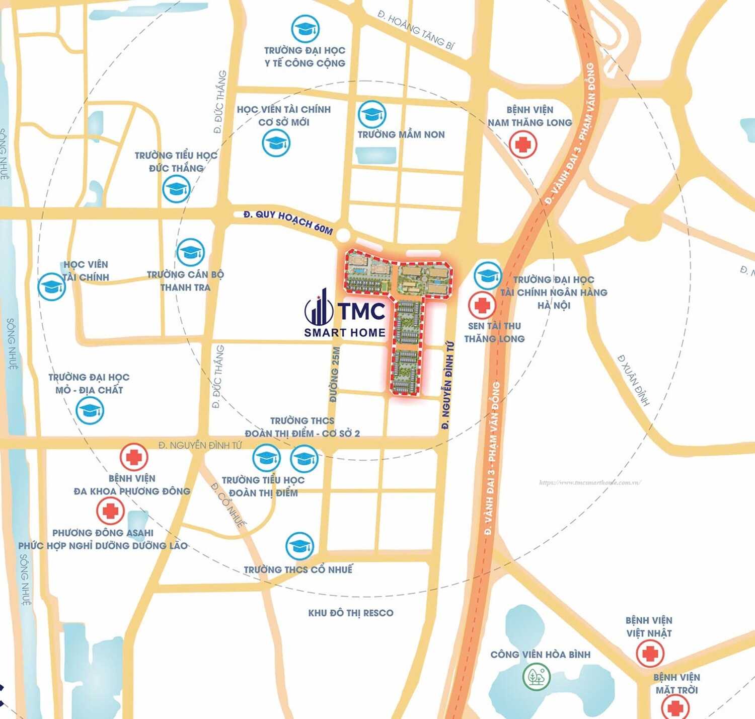Dự án TMC Smart Home sở hữu vị trí chiến lược tại phường Cổ Nhuế, Bắc Từ Liêm – khu vực đang có tốc độ phát triển mạnh mẽ về hạ tầng và kinh tế của thủ đô Hà Nội. Với vị trí thuận lợi, cư dân dễ dàng kết nối đến các khu vực trung tâm và các tiện ích xung quanh: