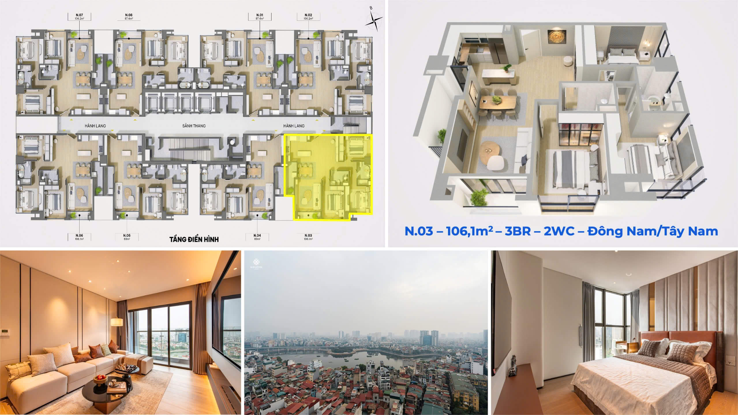 • Căn hộ 3 phòng ngủ: Từ 106 m².