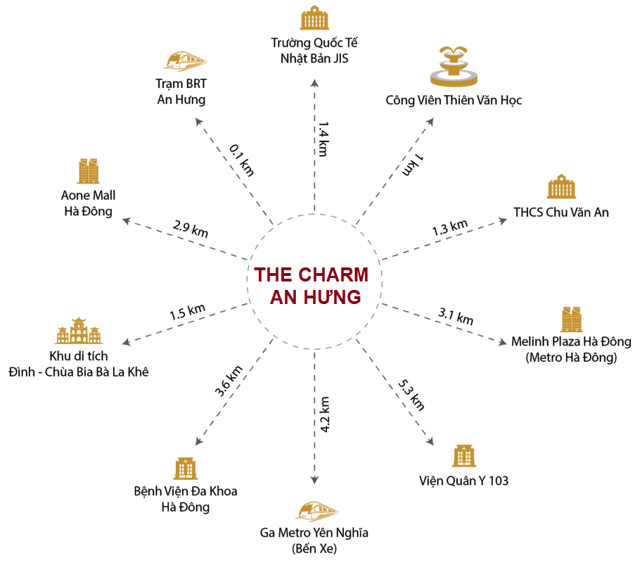 Dự án The Charm An Hưng có vị trí đắc địa – Tọa lạc ngay cửa ngõ của KĐT An Hưng, mặt đường Tố Hữu, Phường La Khê, quận Hà Đông, Hà Nội. Với trạm xe bus BRT An Hưng ngay trước mặt dự án giúp cư dân nơi đây dễ dàng di chuyển tới các địa điểm trong trung tâm thành phố, ga tàu điện La Khê chỉ 6 phút, tới bến xe Yên Nghĩa 10 phút di chuyển.
